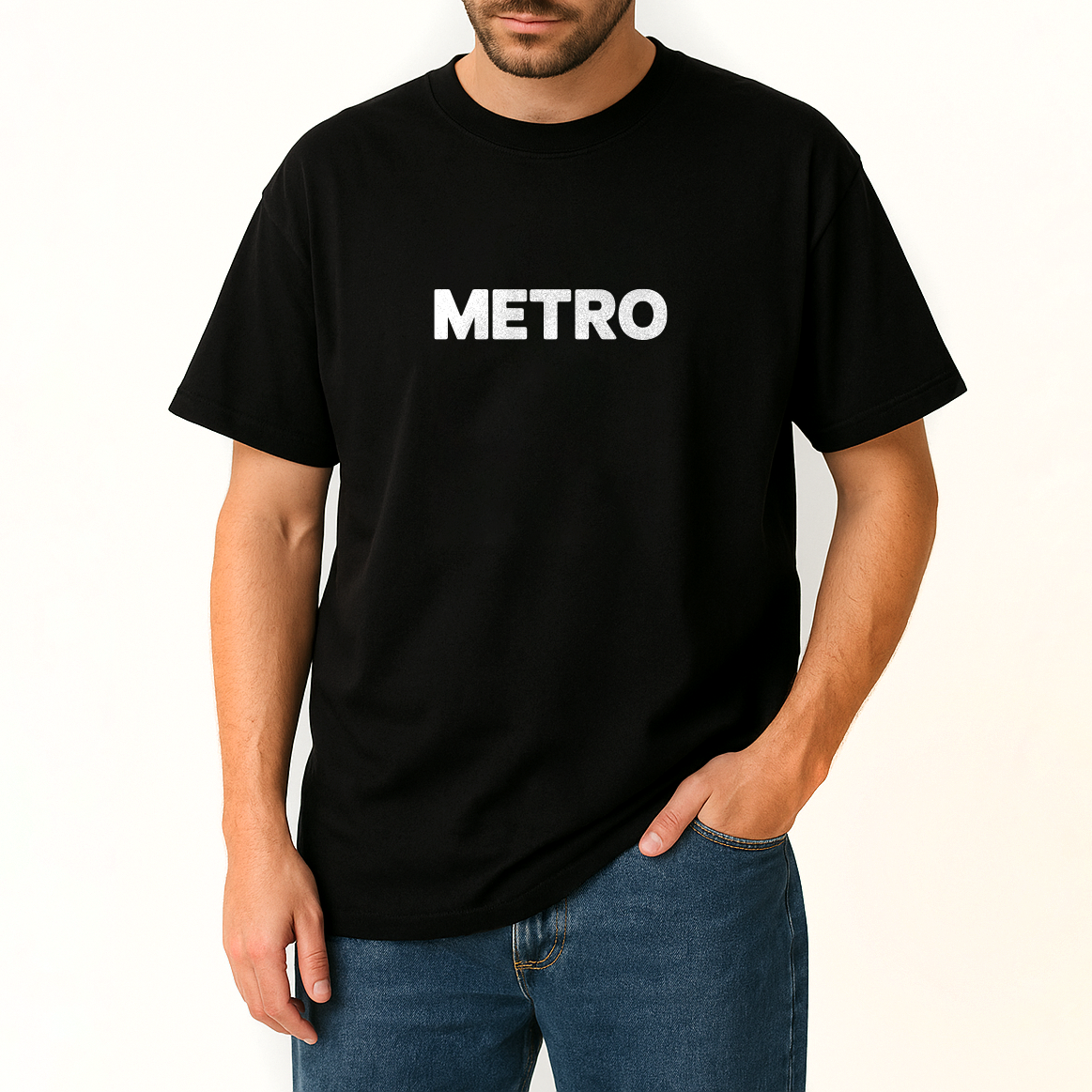 Klasyczny czarny t-shirt z logo METRO. Nadruki zostały wykonane metodą sitodruku. T-shirt uszyty w polskiej szwalni, wykonany ze 100% wysokogatunkowej bawełny pół czesanej.